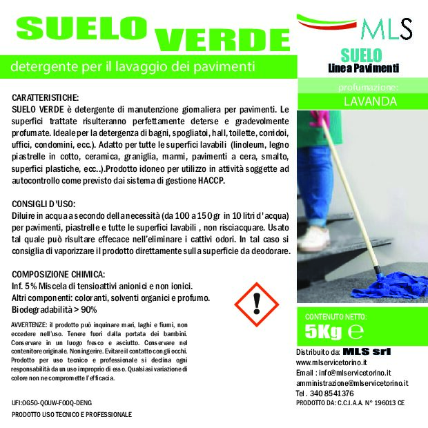 SUELO VERDE al profumo di lavanda è un detergente di manutenzione giornaliera per pavimenti. Le superfici trattate risulteranno perfettamente deterse e gradevolmente profumate. Ideale per la detergenza di bagni, spogliatoi, hall, toilette, corridoi, uffici, condomini, ecc.). Adatto per tutte le superfici lavabili (linoleum, legno piastrelle in cotto, ceramica, graniglia, marmi, pavimenti a cera, smalto, superfici plastiche, ecc..).Prodotto idoneo per utilizzo in attività soggette ad autocontrollo come previsto dai sistema di gestione HACCP.